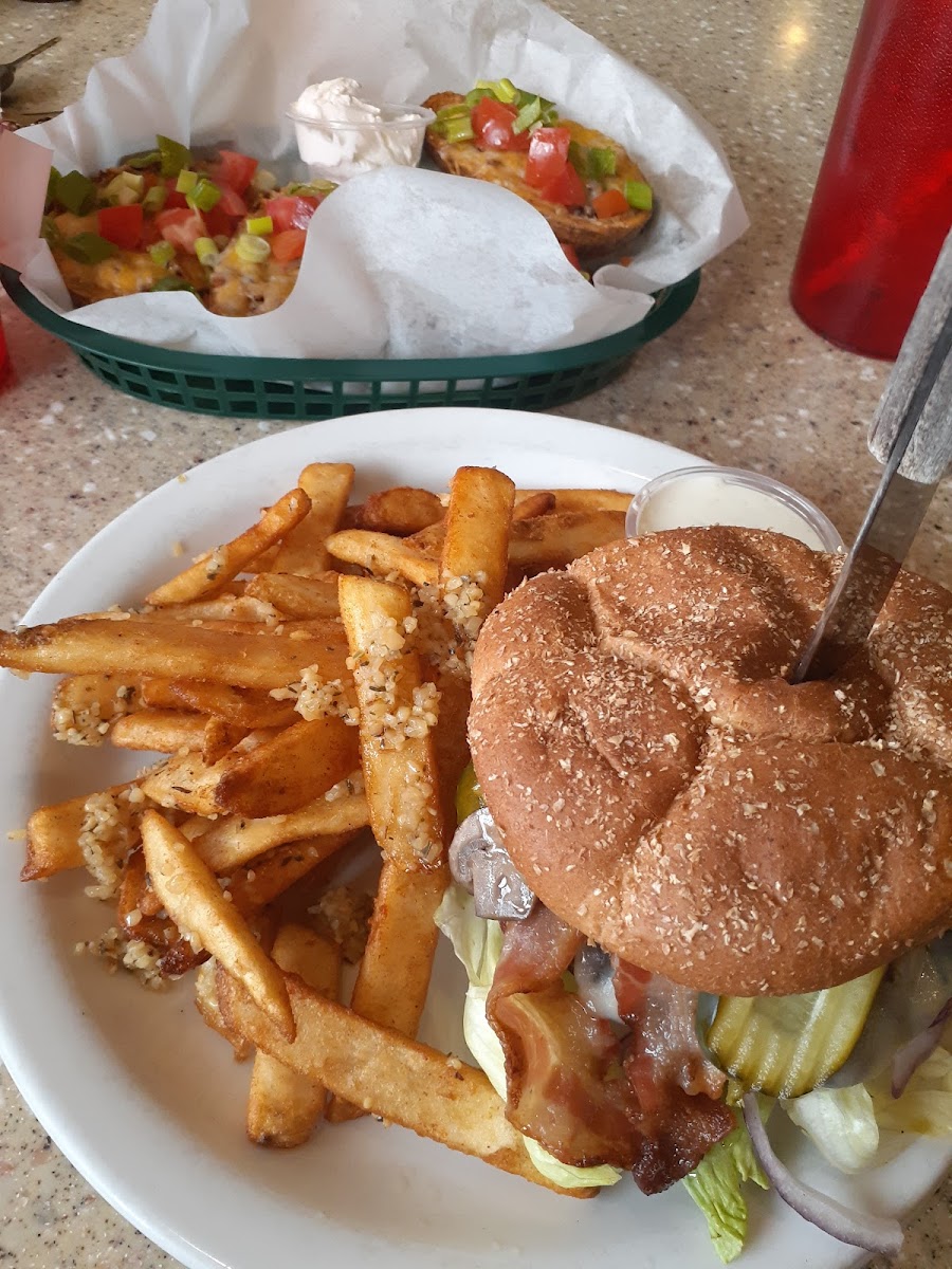 We came in on Thursday for lunch and placed a pick up order at the host stand. I ordered the Sierra burger with garlic fries and their chocolate strawberry shake. My husband got their JD burger with garlic fries and a chocolate shake and our daughter got their grilled cheese with cheddar. The burgers were so delicious and juicy, I liked the chocolate strawberry shake more than the chocolate one, and I probably wouldn’t get garlic fries again because they just put minced garlic right on top. The grilled cheese was buttery and so yummy. I came in and it was not busy and we were the only pick up order while we were there. There was a woman who was at the cash register who was getting ready to leave and was really avoiding helping us, so we had to wait for another waitress, which didn’t take too long but no one was in a hurry to help us. I also tried calling a couple times while we were driving over to place the order over the phone and no one answered. Then I placed the order and no one came to tell us it was ready even though we sat right by the cash point waiting for it. I had to go up and ask. The lady that didn’t want to help me was still there and still avoiding helping me, she wouldn’t even turn around and look at me. We finally got someone to come over and the food had been ready, I don’t know how long it was just sitting there and no one was going to say anything. The restaurant is a little old and small and connected to a casino. Its atmosphere and service were not great but we will be coming back for the good food.