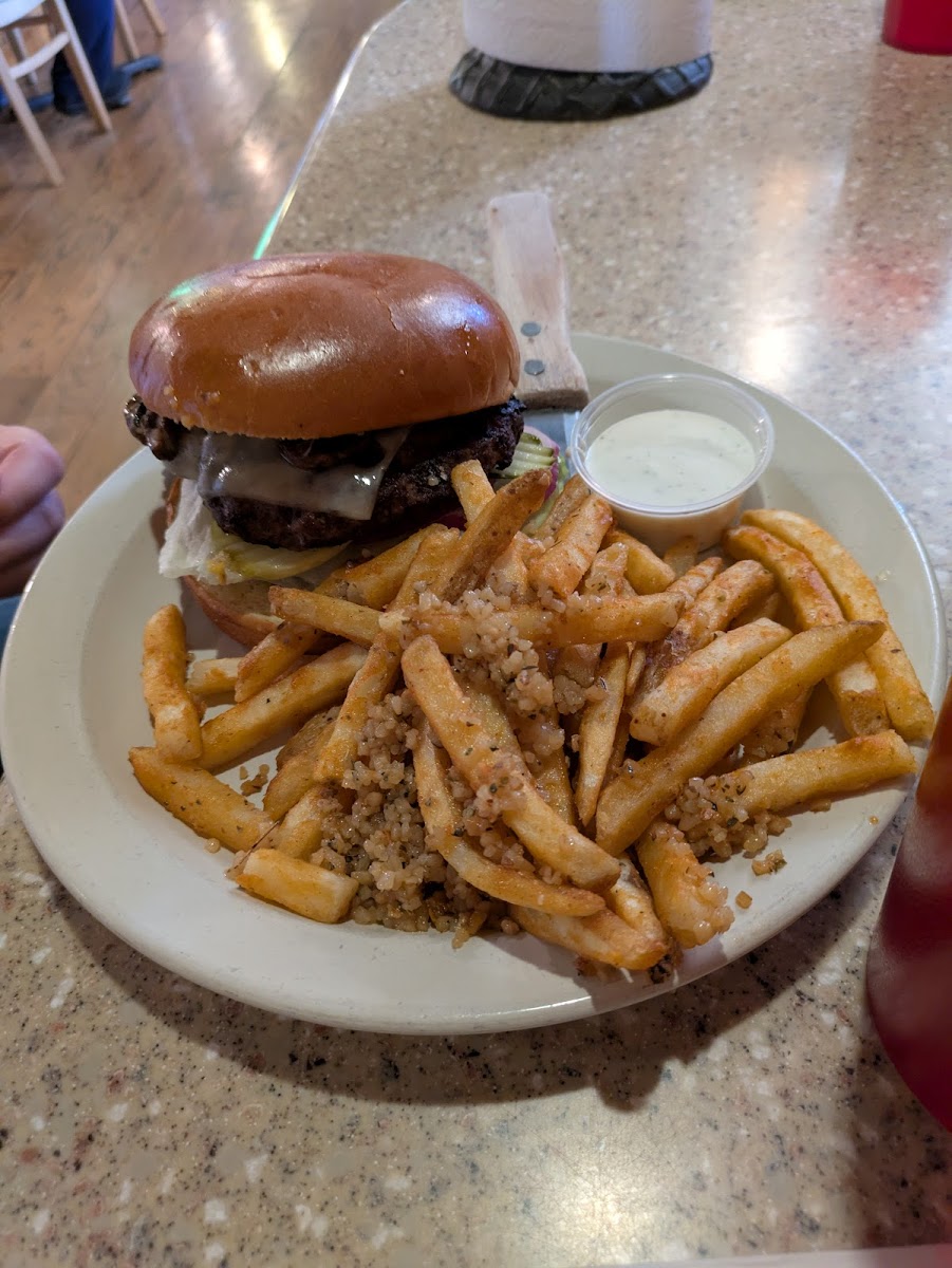 So we were in town for a baby appointment and I wanted a good cheeseburger for my birthday lunch. Well after some searching I came upon this place and let me tell you it did not disappoint. I had the Pastrami Cheeseburger and it was more then I expected. It was big and juicy and full of flavor. My girl ordered the bacon cheeseburger and it also was big, juicy and full of flavor. The garlic fries were also very good and excellent service as well. Highly recommend this place.